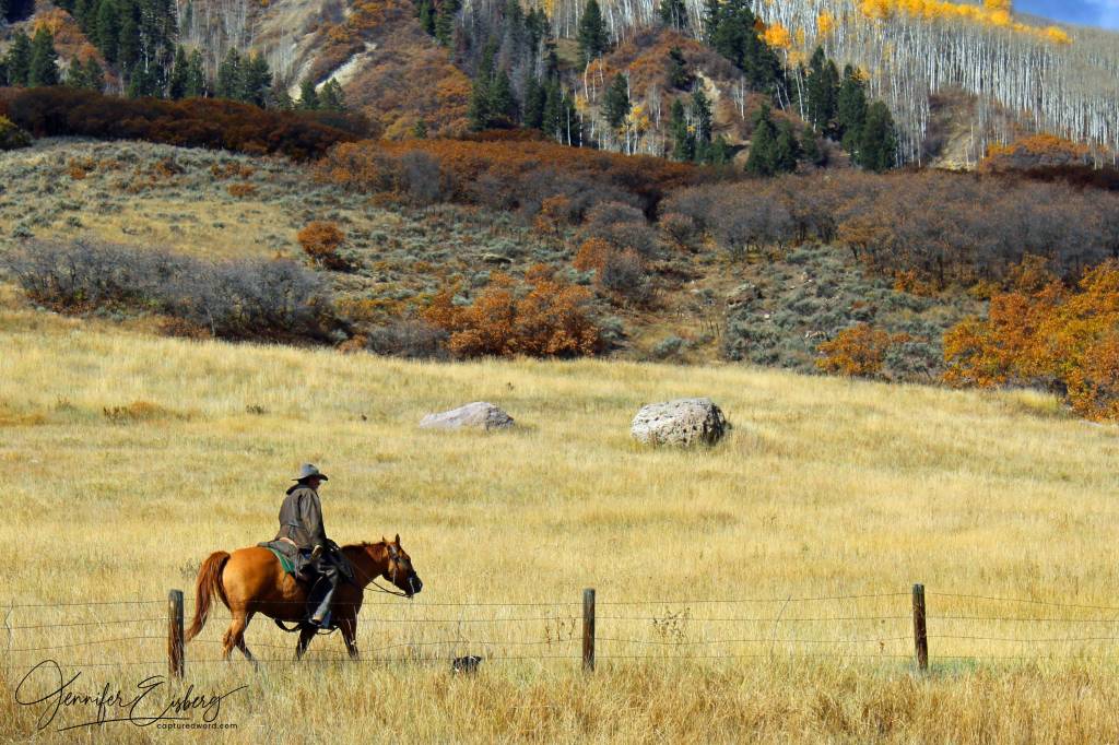I’m not sure why this capture calls to me so much. Maybe because I am by nature a quiet person and the solitude, the peace, and the beautiful fall colors I see here all call to my heart? Maybe because it reminds me of my Dad? Or all the cowboy movies Dad and I watched on Sunday afternoons? Maybe because the photo shows movement and action and encourages the same? All of it?