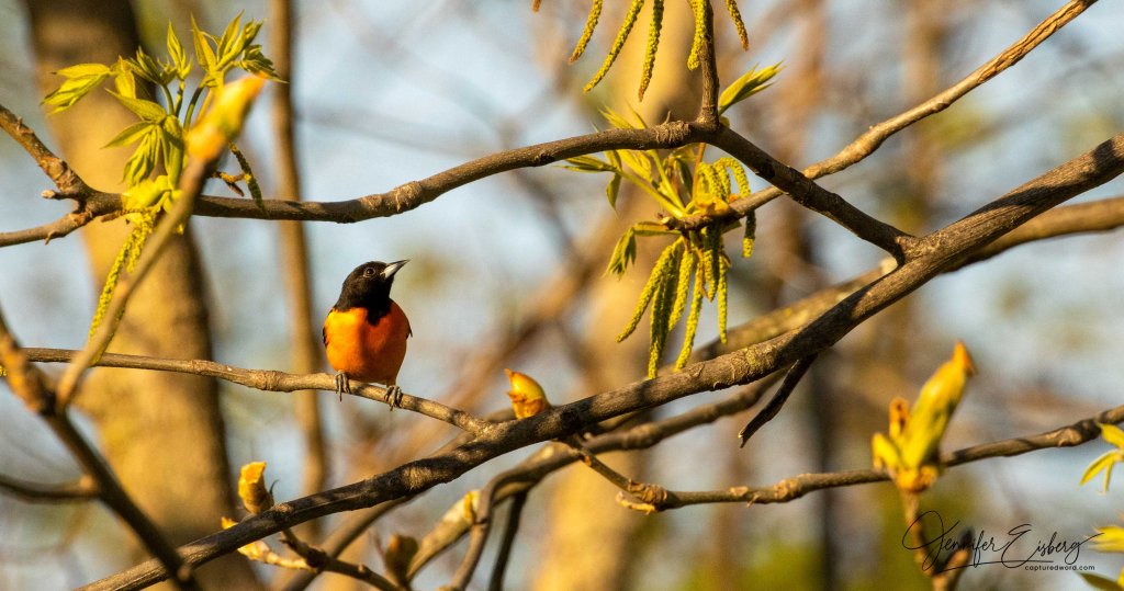 The Oriole feeder is mounted to the side of our deck. We only saw him once last year, but we’ve seen him several times this year, but never when I had my camera. Now, here I am, my back to the deck, camera in hand. Could it be?