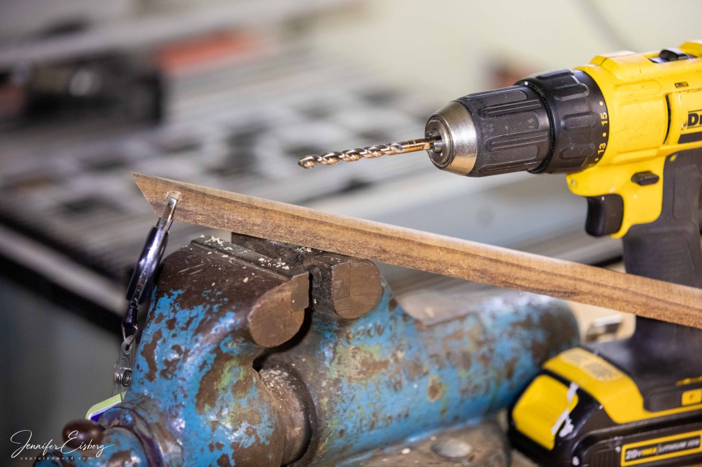 I went back upstairs to get my forgotten mask and when I came back to the kitchen, the coffee items were still on the counter, but the Iceman was gone. As I went out to the garage, he was standing at his work bench, drill in hand, a leftover piece of ¼ round trim board in his vice. After the drilling, he held it out to me and asked if this would work. Low and behold, my badge clips perfectly through the hole, and voila! I will now have 5-foot arms, more than enough reach. It would work perfectly!