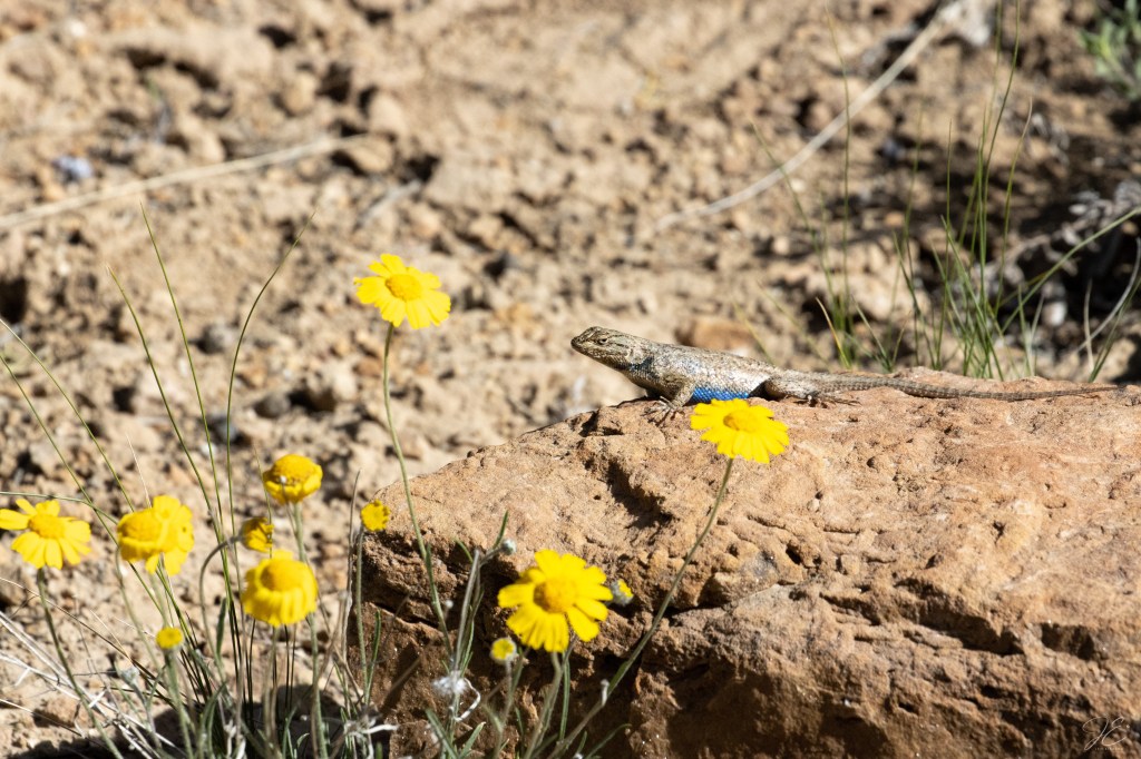 After additional direction, I finally saw the small lizard. Since he seemed content to sun himself, I went to get my camera to see if I could capture his photo. For reference, the yellow flowers in the photo are about the size of a half dollar, maybe a bit smaller. He’s a tiny little dude!